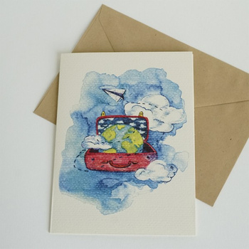 Kartka okolicznościowa - walizka + niebo + kula ziemska